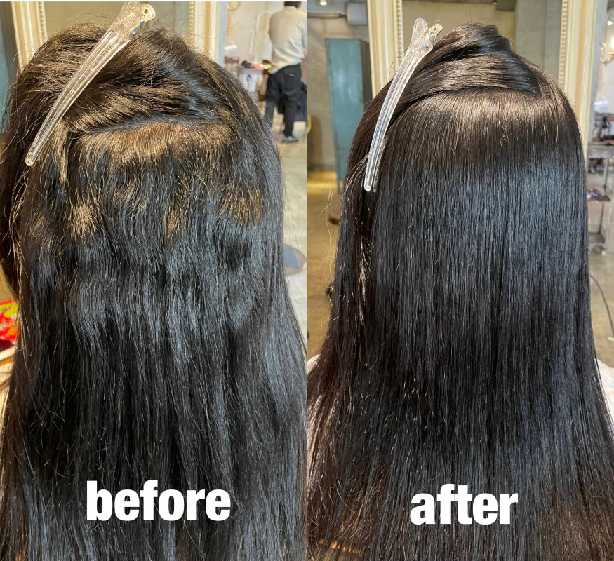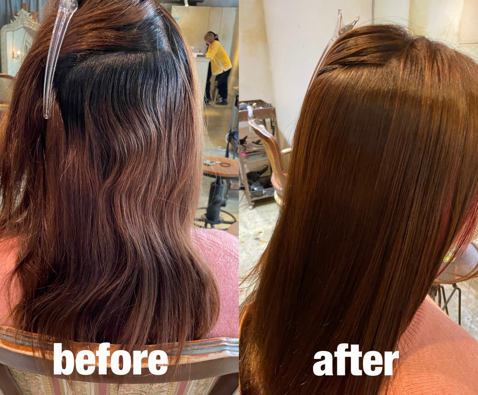 根元は伸びた分縮毛矯正をして毛先は酸熱トリートメントでケアをしました。