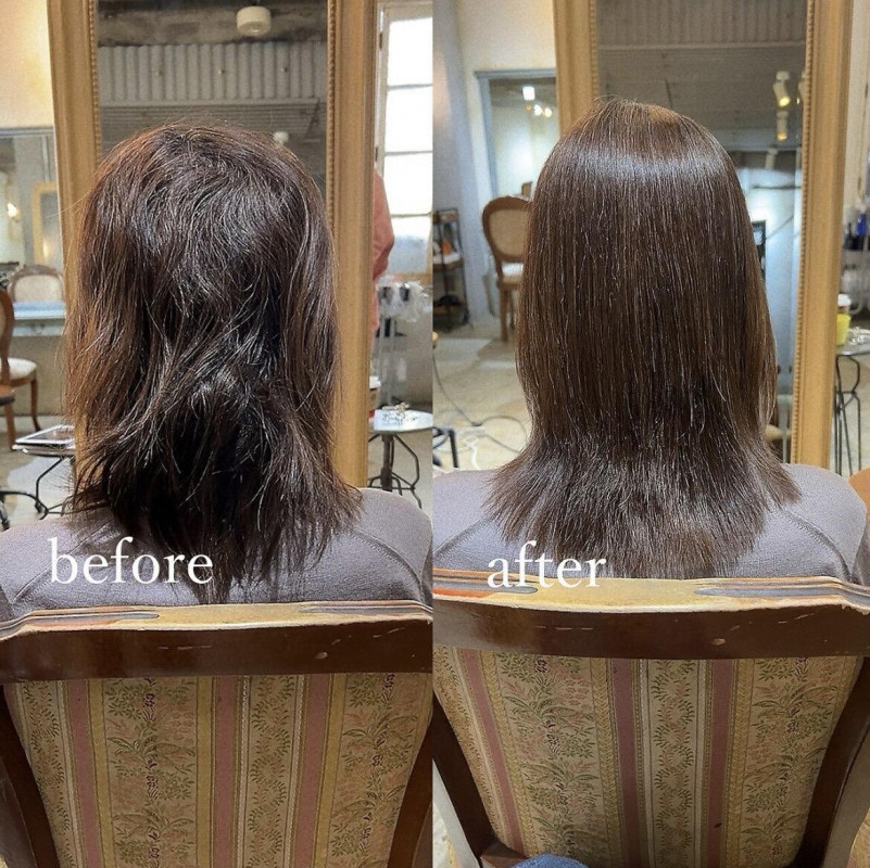 こちらのお客様は、全体的に縮毛矯正をして最後に髪質改善トリートメントをしました。