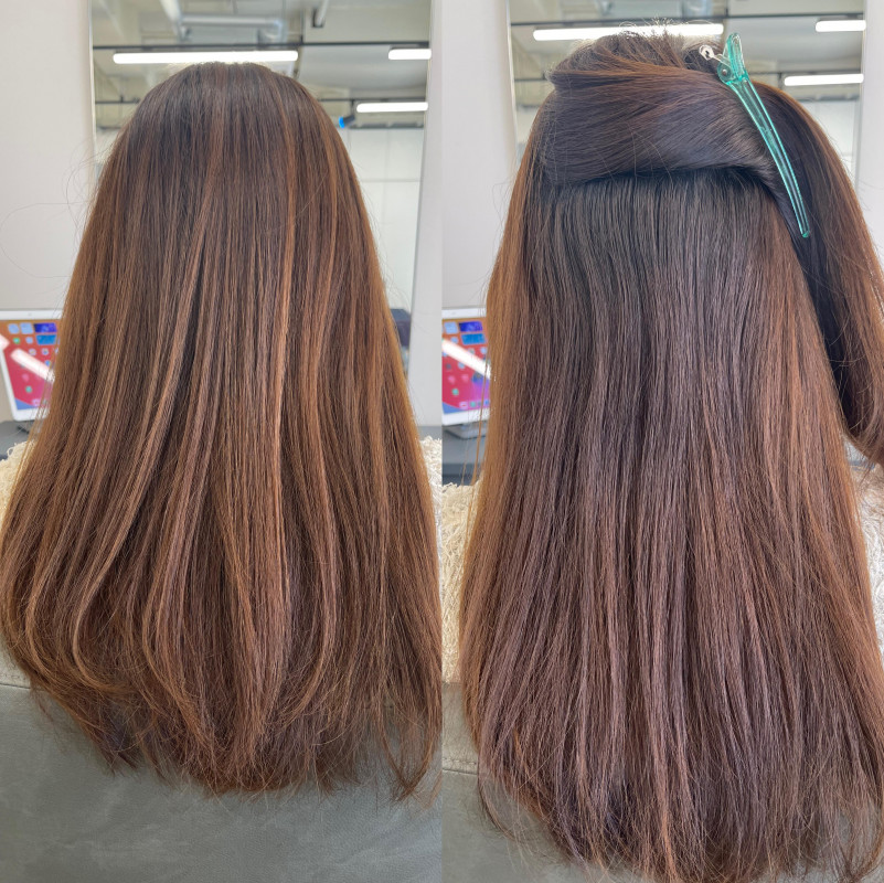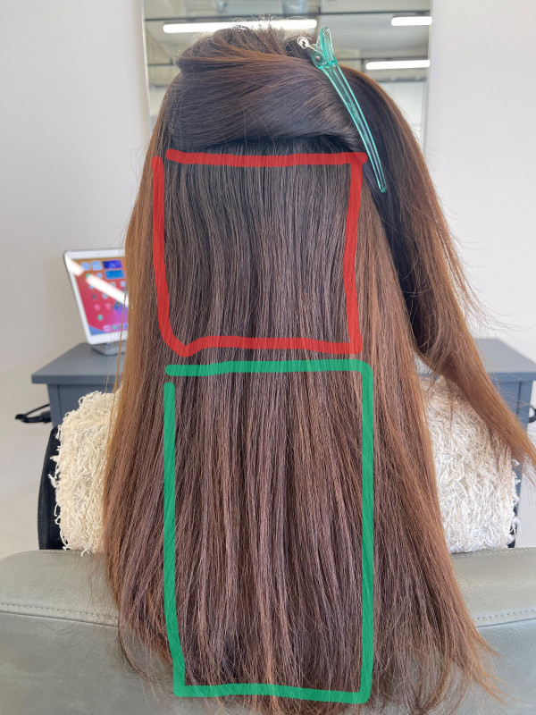 この塗り分けができていないと、アフターで、不自然に真っ直ぐ、毛先だけ傷んでいる