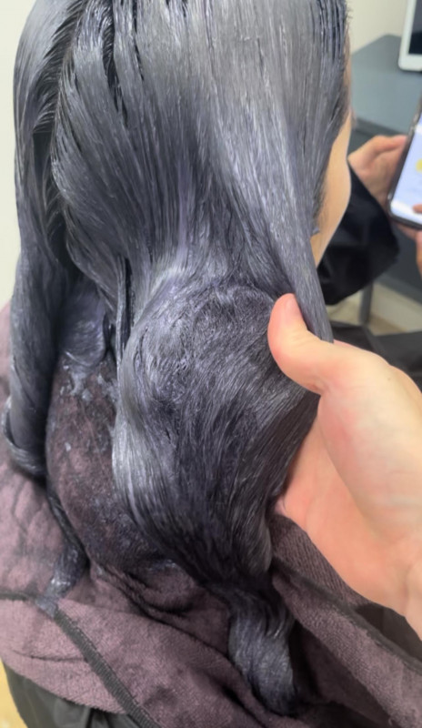 薬剤を根元・中間・毛先で塗り分けます。