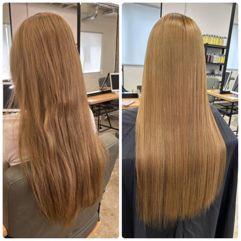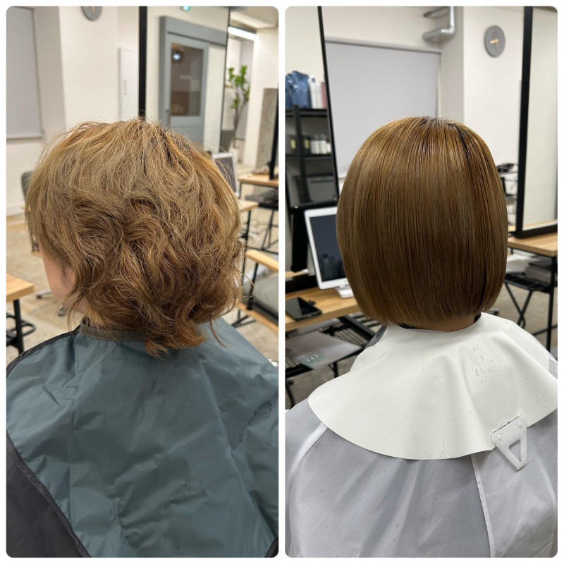 《弱酸性の縮毛矯正Before、after その7》 《お悩み》ブリーチをしているから縮毛矯正を断られた。 弱酸性の縮毛矯正はブリーチ毛でも真っ直ぐでサラサラな髪の毛にできる為 ブリーチをしている方におすすめのメニューになっています。 アルカリでする場合もあるのでカウンセリング時に しっかりとお伝えします。 《弱酸性の縮毛矯正Before、after その8》 《お悩み》縮毛矯正をかけているが元々癖が強く綺麗にしたい。 元々縮毛矯正をしている方は変にアルカリの縮毛矯正で 施術をしてしまうと髪の毛がボロボロになってしまします。 そのためこのようなお悩みがある方、ダメージを気にされる方は 絶対的に弱酸性の縮毛矯正をお勧めします。 《弱酸性の縮毛矯正Before、after その9》 《お悩み》元々縮毛矯正をしていたがブリーチしたら広がった。綺麗にしてほしい。 髪の毛を綺麗に、かつ癖を伸ばしたい場合は 絶対に弱酸性の縮毛矯正がお勧め! 髪質改善をしながら癖を綺麗に伸ばすことが出来ます! 髪の毛に潤いと艶をだしてくれるので ブリーチ毛でも綺麗にすることが出来ます!! 《弱酸性の縮毛矯正Before、after その10》 《お悩み》ブリーチしたらうねりが出て広がった。サラサラにしてほしい。 この場合はいくらトリートメントを頑張っても 綺麗にはなりません。 なので弱酸性の縮毛矯正をして髪の毛に負担をかけずに じっくり時間をかけて綺麗にしていきます! ブリーチ毛でお困りの方は是非!!
