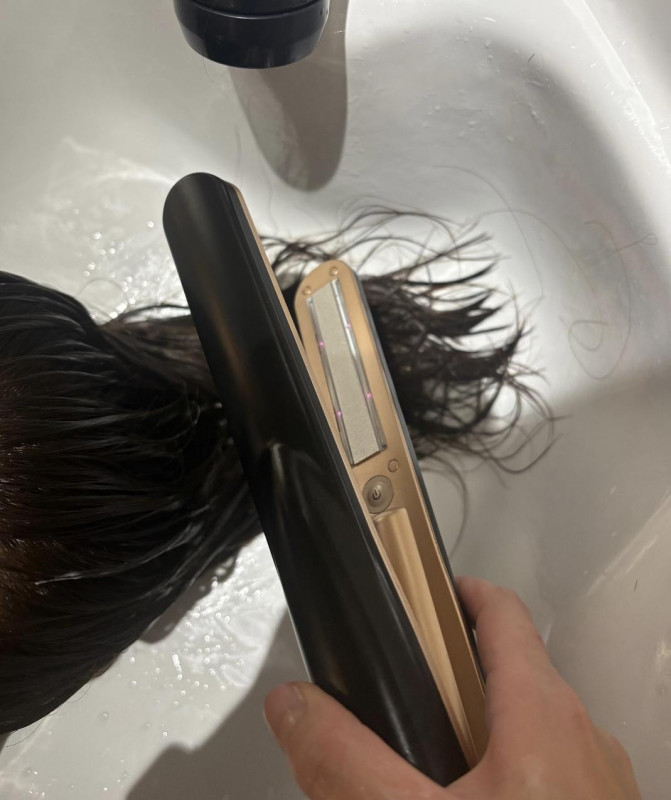ここで超音波アイロンを髪の毛に通します。