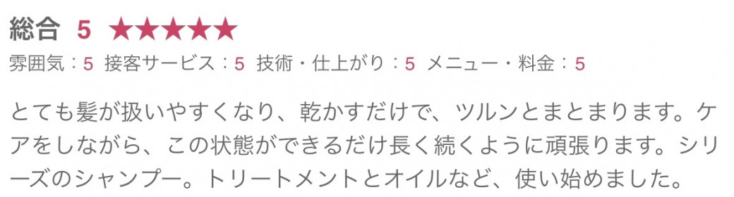 ツヤツヤ、まとまりやすい、自然で柔らかい感じ